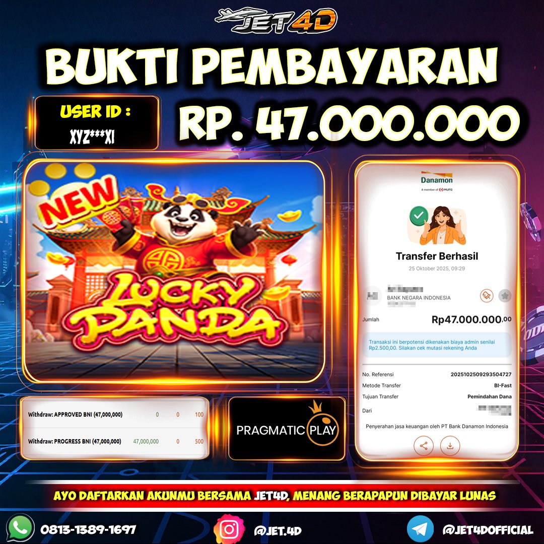 JET4D PESONA PANDA PEMBAWA CUAN Selamat Kepada Member Setia Atas Withdraw Rp 47.000.000 Hari ini. List member yang sebelumnya mendapatkan withdraw besar bisa cek Disini dan di LINK ini.pelanyanan nonstop
