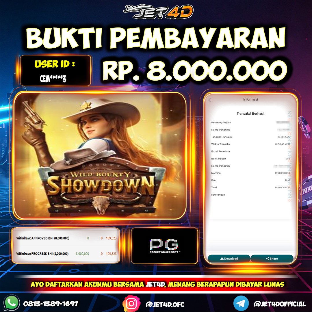JET4D SEKALI DEPO MENANG SETERUSNYA Selamat Kepada Member Setia Atas Withdraw Rp 8.000.000 Hari ini. List member yang sebelumnya mendapatkan withdraw besar bisa cek Disini dan di LINK ini.pelanyanan nonstop