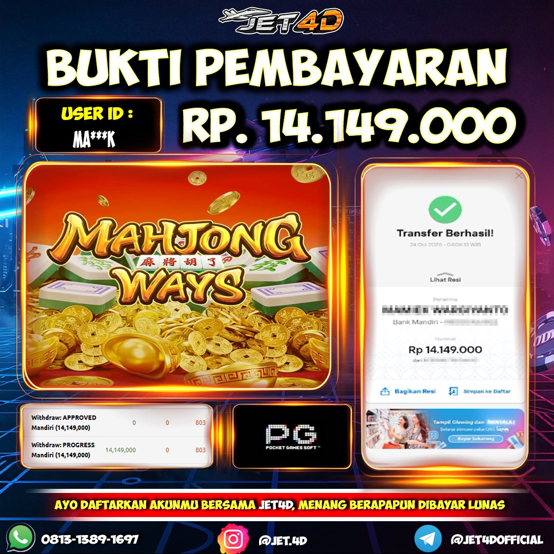 JET4D MAHJONG TERGACOR #1 Selamat Kepada Member Setia Atas Withdraw Rp 14.149.000 Hari ini. List member yang sebelumnya mendapatkan withdraw besar bisa cek Disini dan di LINK ini.pelanyanan nonstop dan