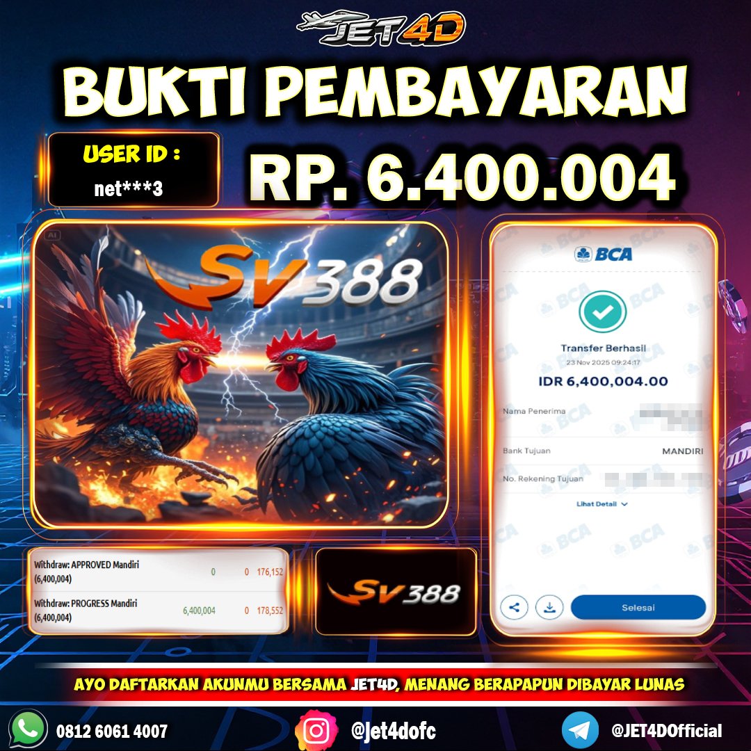 JET4D AKSI SABUNG AYAM TERBAIK Selamat Kepada Member Setia Atas Withdraw Rp 6.400.004 Hari ini. List member yang sebelumnya mendapatkan withdraw besar bisa cek Disini dan di LINK ini.pelanyanan nonstop