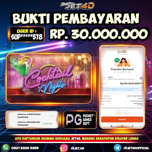 JET4D COCKTAIL NIGHTS Selamat Kepada Member Setia Atas Withdraw Rp 30.000.000 Hari ini. List member yang sebelumnya mendapatkan withdraw besar bisa cek Disini dan di LINK ini.pelanyanan nonstop dan profesional hanya ada