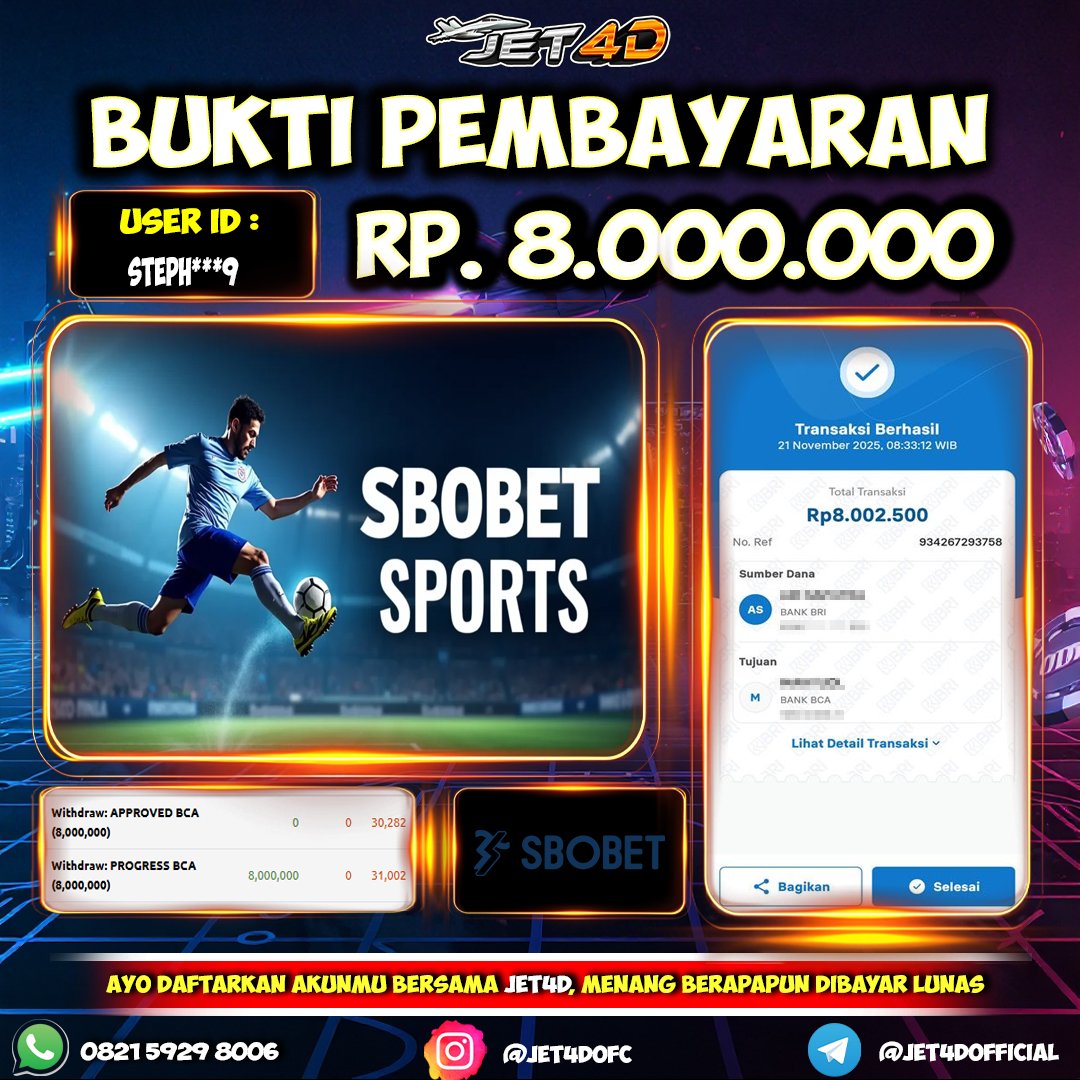 JET4D PILIHAN TEPAT PECINTA SPORTSBOOK Selamat Kepada Member Setia Atas Withdraw Rp 20.000.000 Hari ini. List member yang sebelumnya mendapatkan withdraw besar bisa cek Disini dan di LINK ini.pelanyanan nonstop dan