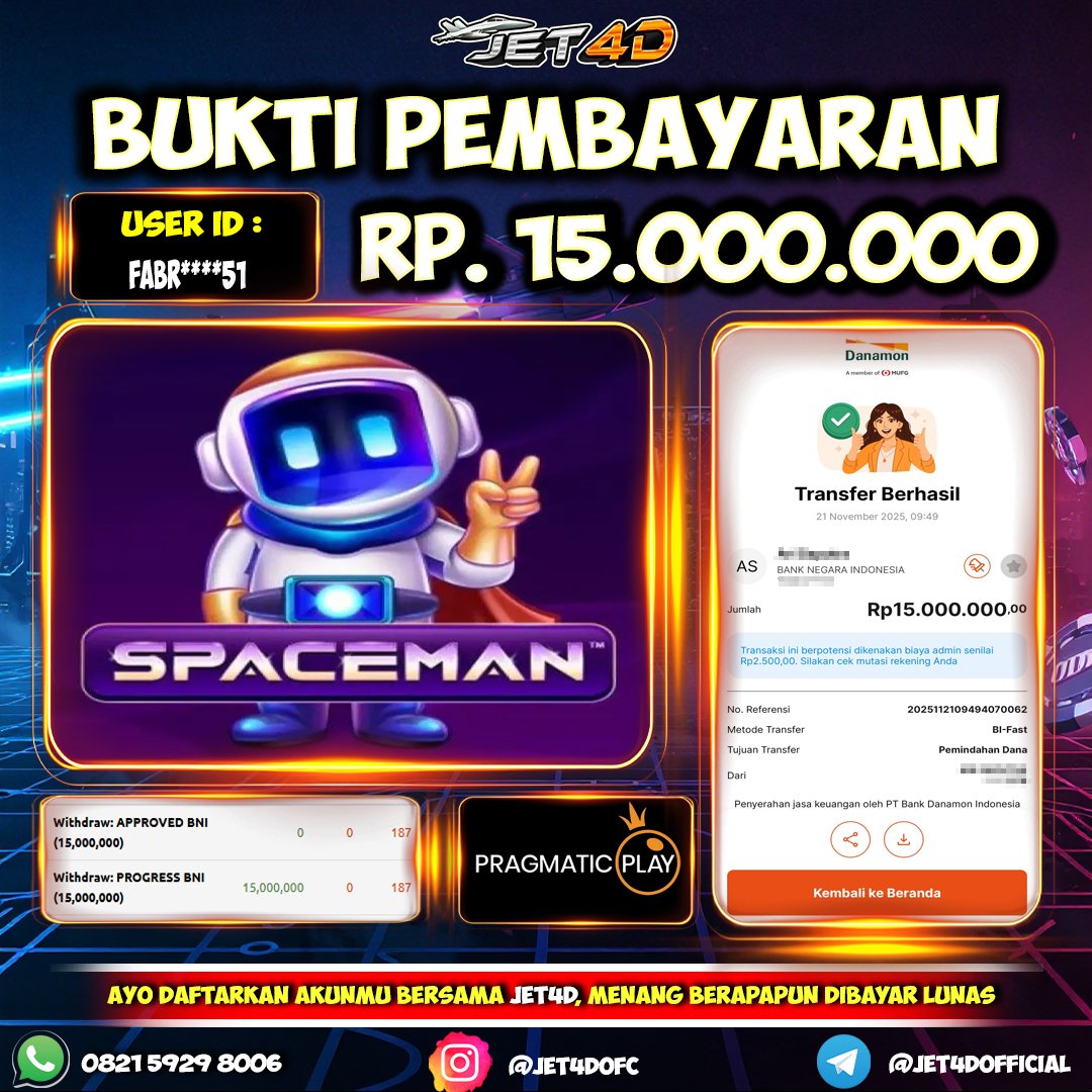 JET4D TERBANG LEBIH TINGGI, MENANG LEBIH BESAR Selamat Kepada Member Setia Atas Withdraw Rp 25.000.000 Hari ini. List member yang sebelumnya mendapatkan withdraw besar bisa cek Disini dan