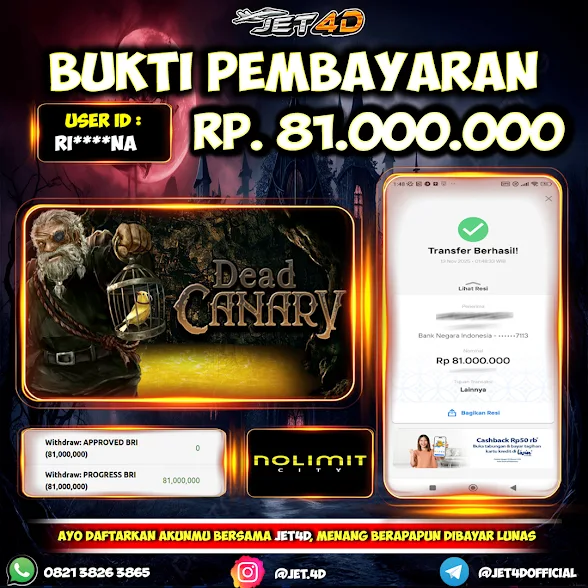 JET4D Dead Canary Selamat Kepada Member Setia Atas Withdraw Rp 81.000.000 Hari ini. List member yang sebelumnya mendapatkan withdraw besar bisa cek Disini dan di LINK ini.pelanyanan nonstop dan profesional
