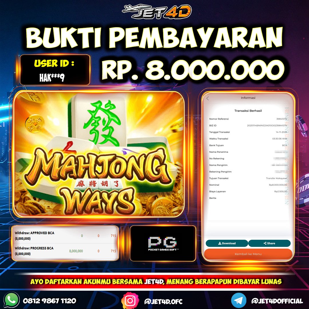 JET4D NO MAHJONG NO PARTY Selamat Kepada Member Setia Atas Withdraw Rp 8.000.000 Hari ini. List member yang sebelumnya mendapatkan withdraw besar bisa cek Disini dan di LINK ini.pelanyanan nonstop
