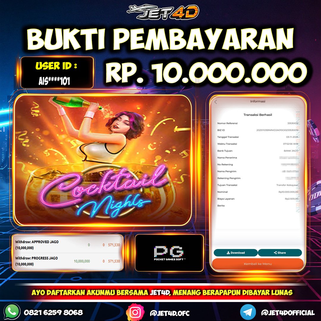 JET4D RAYAKAN MALAM PENUH KEMENANGAN Selamat Kepada Member Setia Atas Withdraw Rp 10.000.000 Hari ini. List member yang sebelumnya mendapatkan withdraw besar bisa cek Disini dan di LINK ini.pelanyanan nonstop