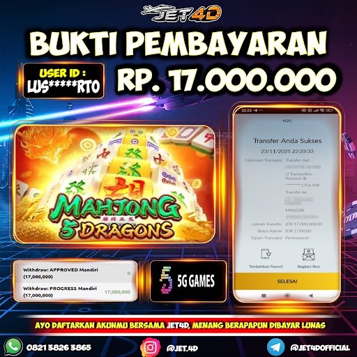 JET4D MAHJONG 5 DRAGONS Selamat Kepada Member Setia Atas Withdraw Rp 30.000.000 Hari ini.
