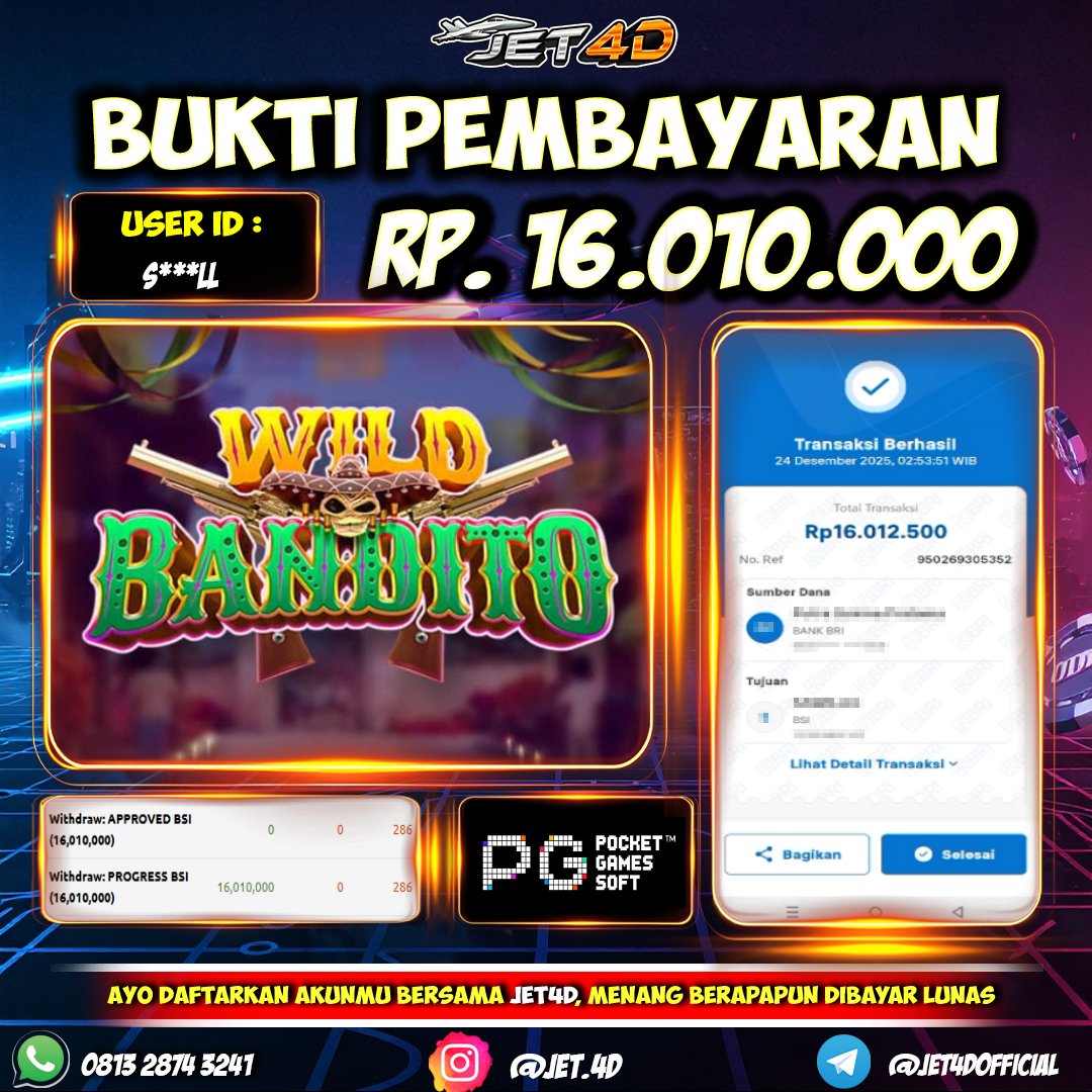 JET4D WILD BANDITO Selamat Kepada Member Setia Atas Withdraw Rp. 16.010.000 Hari ini List member yang sebelumnya mendapatkan withdraw besar bisa cek Disini dan di LINK ini.pelanyanan nonstop dan profesional