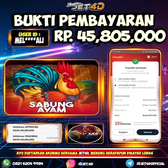JET4D Sabung ayam Selamat Kepada Member Setia Atas Withdraw Rp 45.805.000 Hari ini. List member yang sebelumnya mendapatkan withdraw besar bisa cek Disini dan di LINK ini.pelanyanan nonstop dan profesional