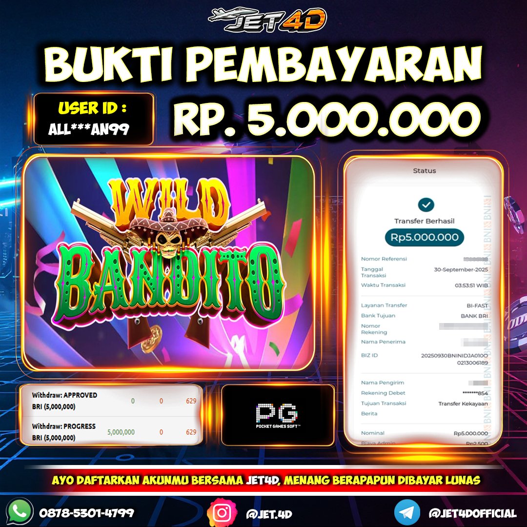 JET4D KEMENANGAN WILD BANDITO Selamat Kepada Member Setia Atas Withdraw Rp 5.000.000 Hari ini. List member yang sebelumnya mendapatkan withdraw besar bisa cek Disini dan di LINK ini.pelanyanan nonstop dan