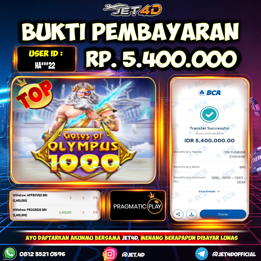 JET4D SAMBARAN ZEUS AUTO WD Selamat Kepada Member Setia Atas Withdraw Rp 5.400.000 Hari ini. List member yang sebelumnya mendapatkan withdraw besar bisa cek Disini dan di LINK ini.pelanyanan nonstop
