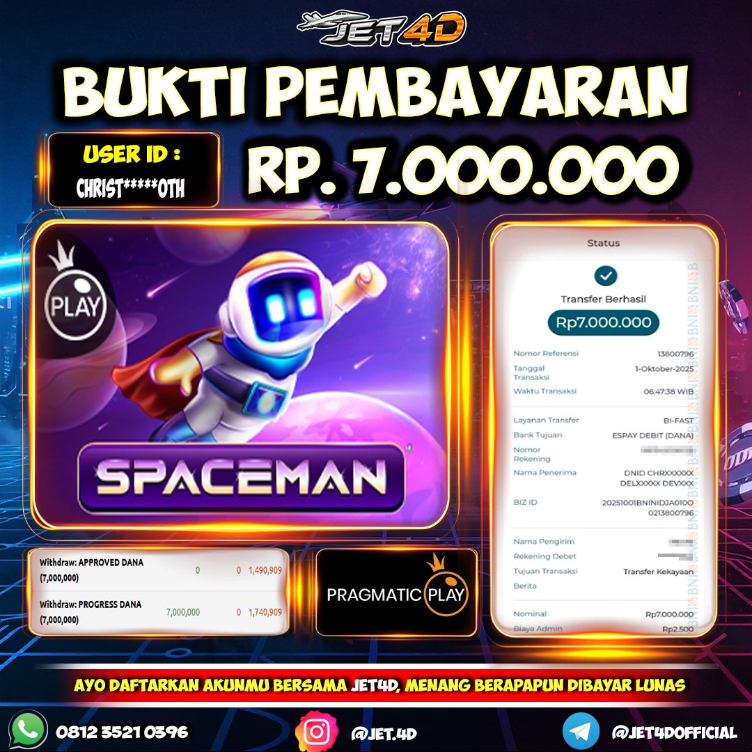 JET4D TERBANGKAN TARUHANMU BERSAMA SPACEMAN Selamat Kepada Member Setia Atas Withdraw Rp 7.000.000 Hari ini. List member yang sebelumnya mendapatkan withdraw besar bisa cek Disini dan di LINK ini.pelanyanan nonstop
