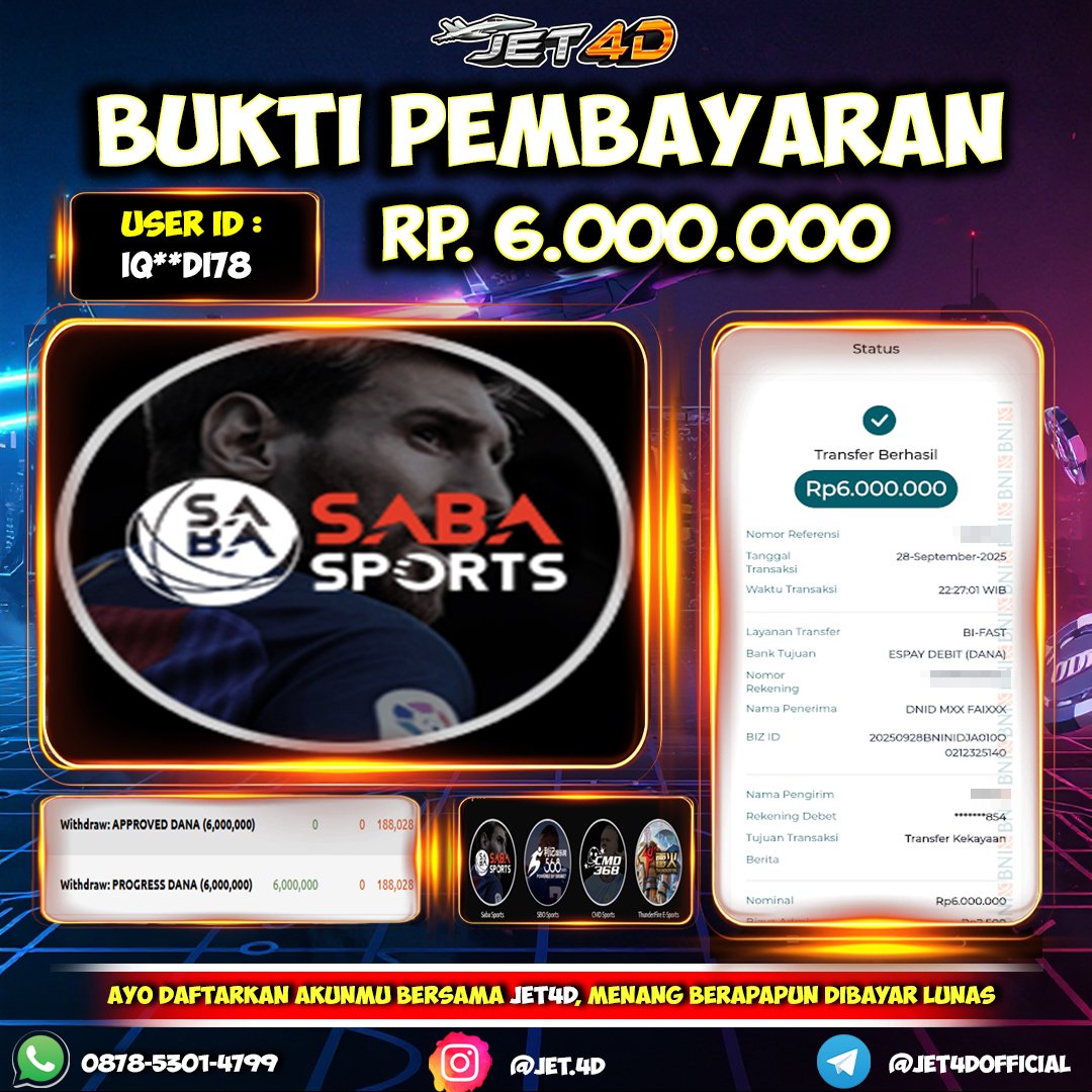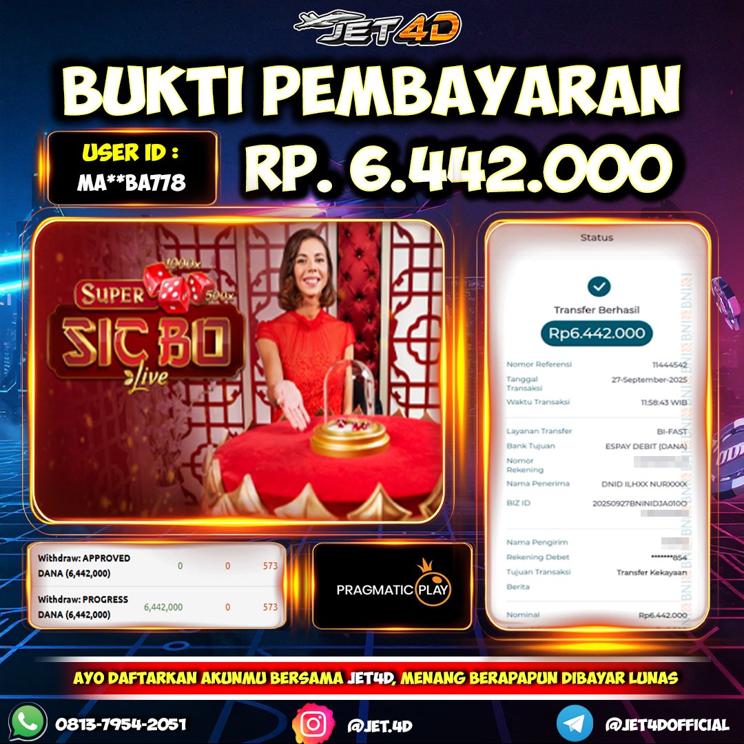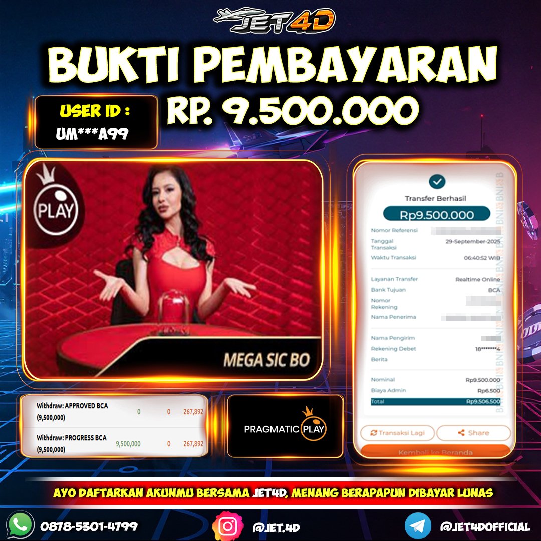 JET4D BUKTI KEMENANGAN MEGA SIC BO Selamat Kepada Member Setia Atas Withdraw Rp 9.500.000 Hari ini. List member yang sebelumnya mendapatkan withdraw besar bisa cek Disini dan di LINK ini.pelanyanan