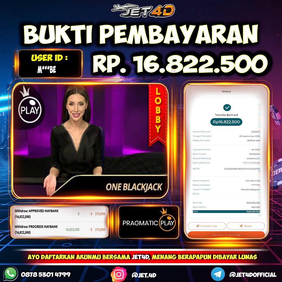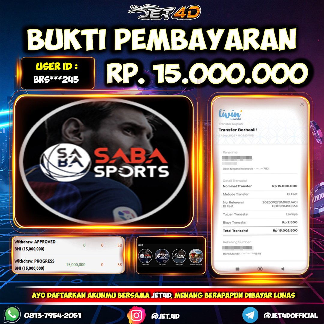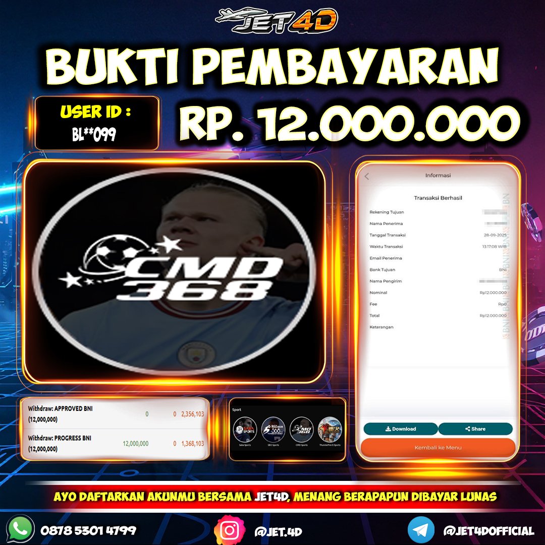 JET4D BUKTI KEMENANGAN MEGA SIC BO Selamat Kepada Member Setia Atas Withdraw Rp 9.500.000 Hari ini. List member yang sebelumnya mendapatkan withdraw besar bisa cek Disini dan di LINK ini.pelanyanan