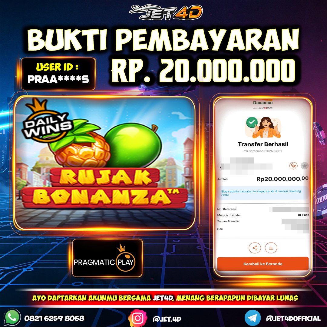JET4D RUJAK BONANZA TERGACOR Selamat Kepada Member Setia Atas Withdraw Rp 20.000.000 Hari ini. List member yang sebelumnya mendapatkan withdraw besar bisa cek Disini dan di LINK ini.pelanyanan nonstop dan