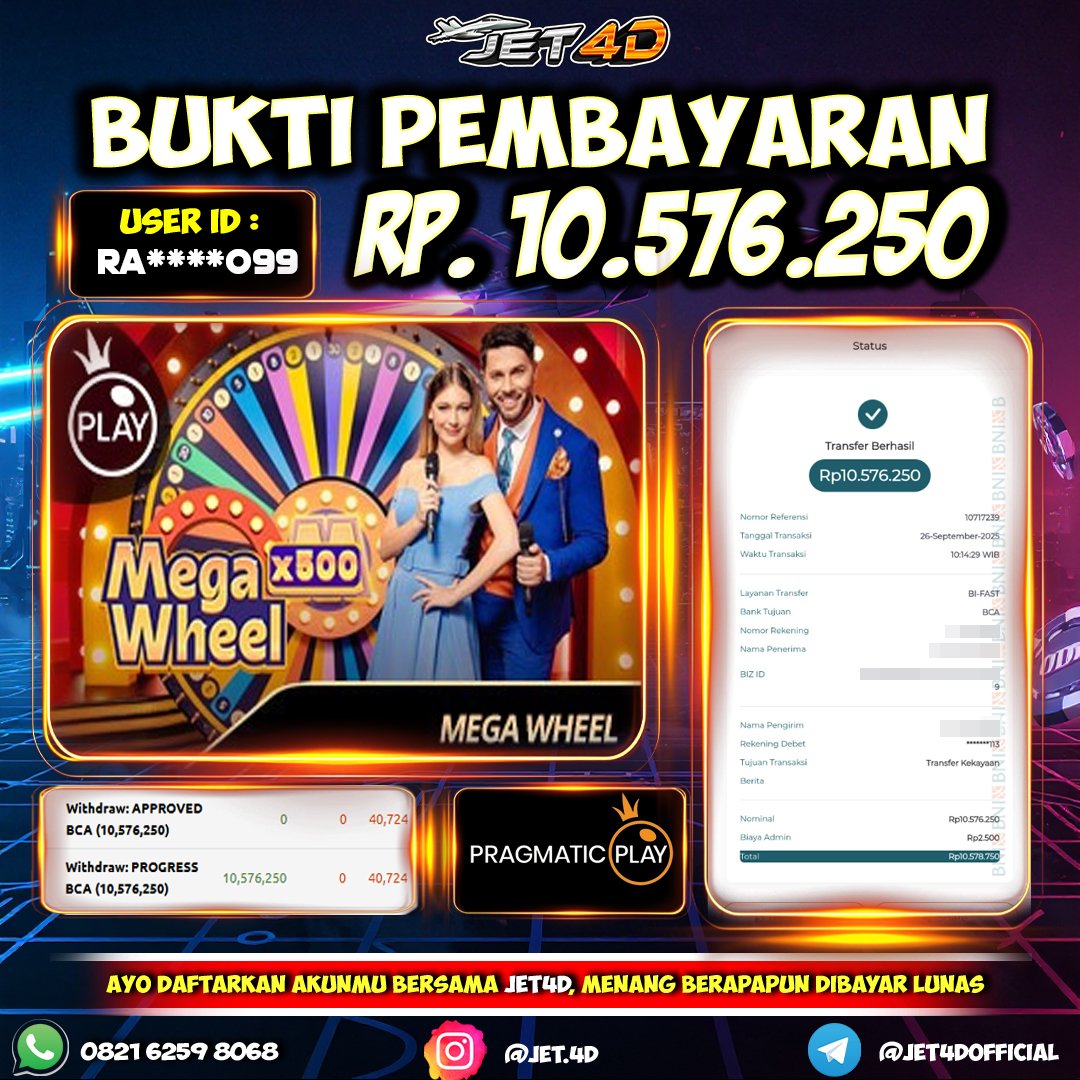 JET4D KEMENANGAN MEGA WHEEL Selamat Kepada Member Setia Atas Withdraw Rp 10.576.250 Hari ini JET4D KEMENANGAN MEGA WHEEL