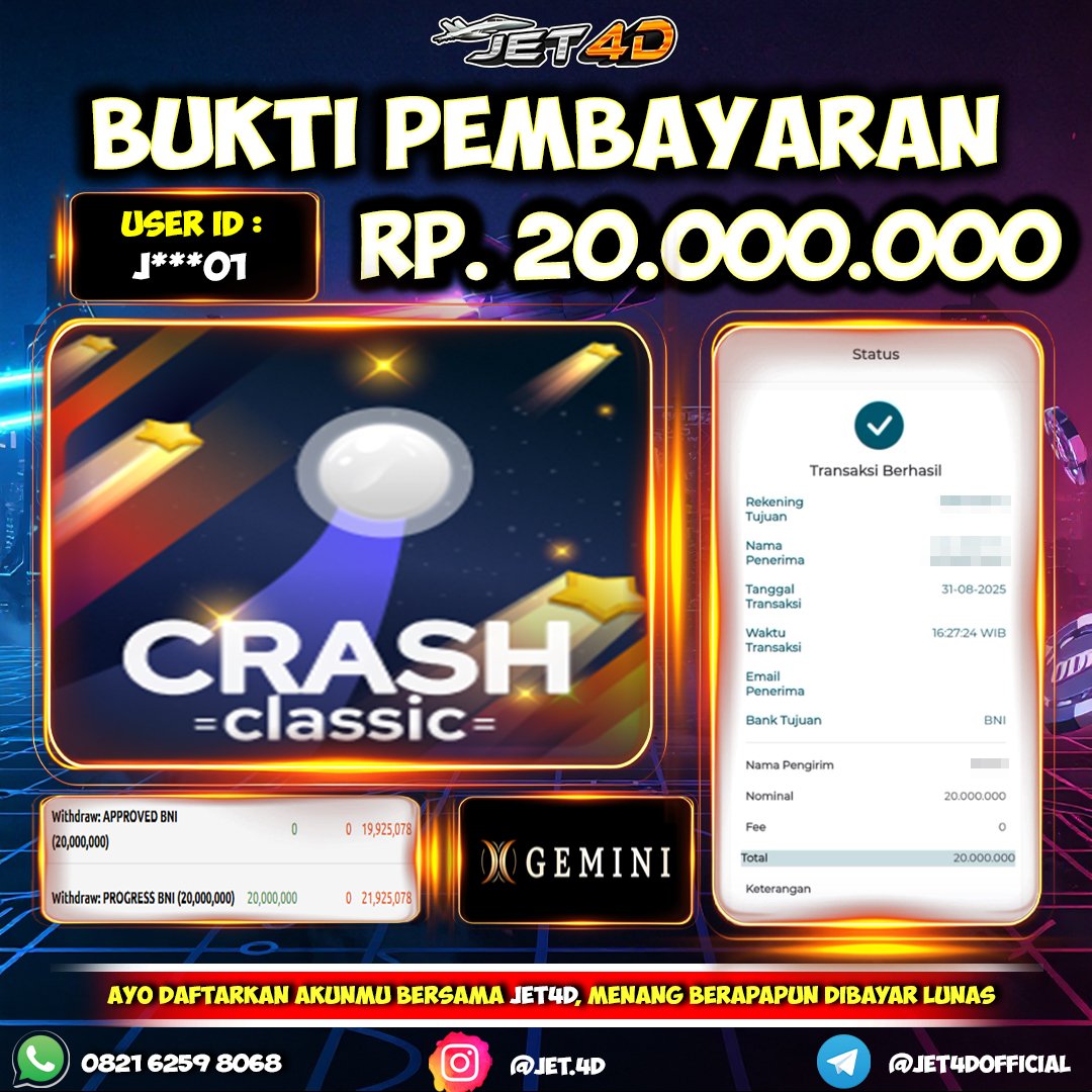 JET4D JACKPOT GEMINI GAMING Selamat Kepada Member Setia Atas Withdraw Rp 20.000.000 Hari ini. List member yang sebelumnya mendapatkan withdraw besar bisa cek Disini dan di LINK ini.pelanyanan nonstop dan