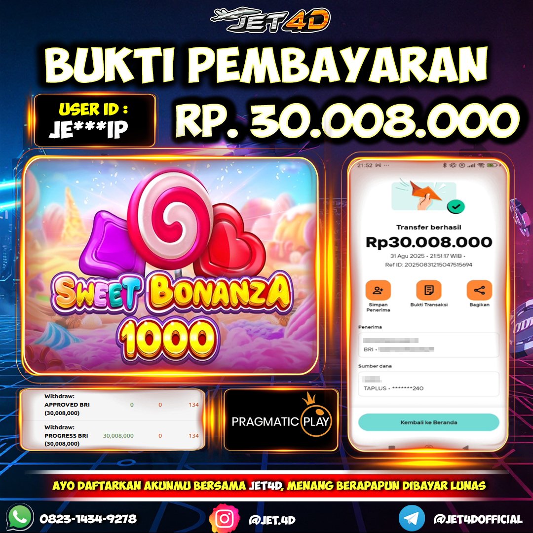 JET4D SWEET BONANZA 1000 Selamat Kepada Member Setia Atas Withdraw Rp 30.008.000 Hari ini. List member yang sebelumnya mendapatkan withdraw besar bisa cek Disini dan di LINK ini.pelanyanan nonstop dan