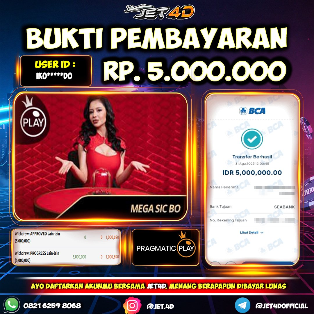 JET4D BUKTI KEMENANGAN MEGA SIC BO Selamat Kepada Member Setia Atas Withdraw Rp 5.000.000 Hari ini. List member yang sebelumnya mendapatkan withdraw besar bisa cek Disini dan di LINK ini.pelanyanan