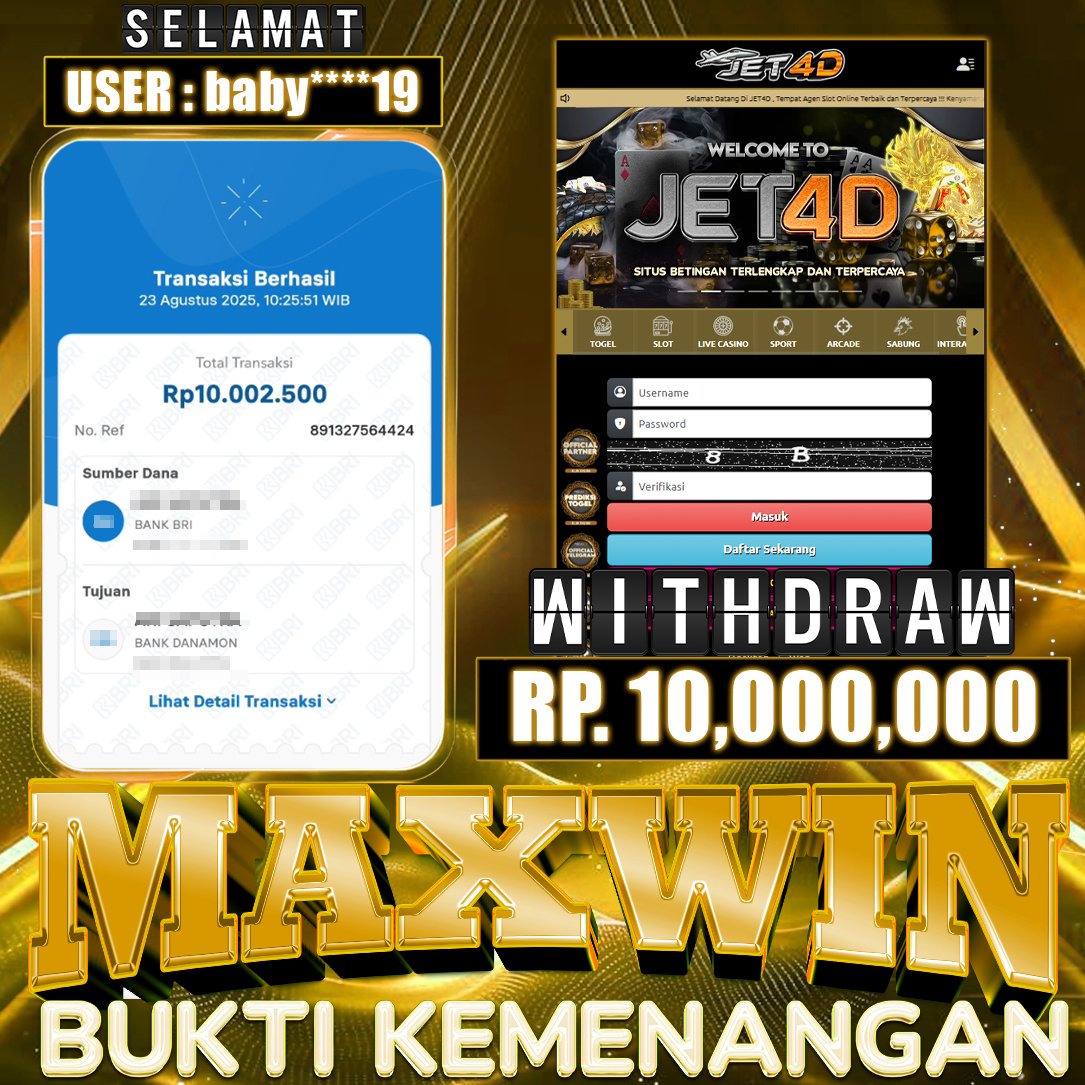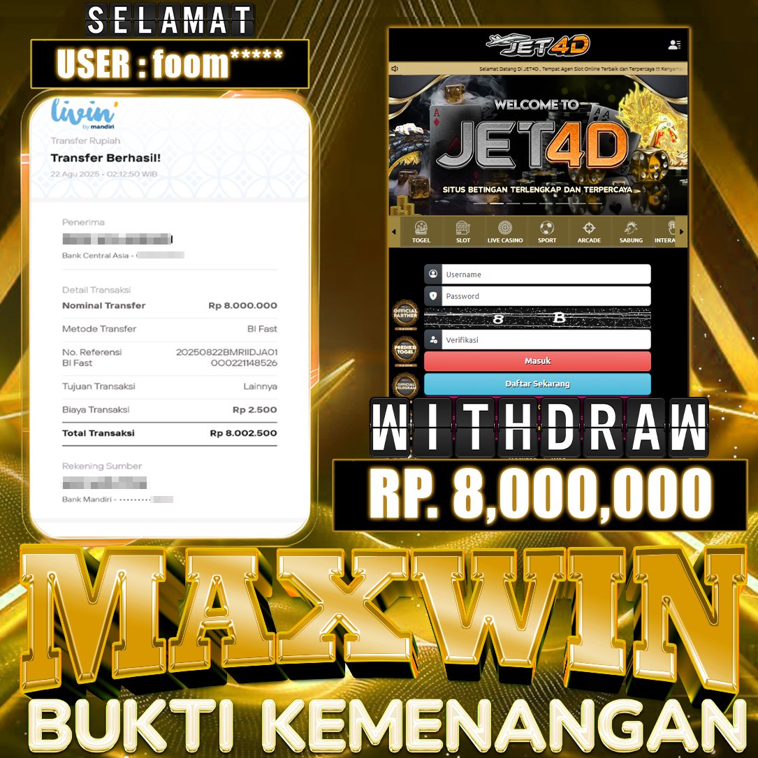 JET4D DAFTAR DAN DAPATKAN BONUS 50% Selamat Kepada Member Setia Atas Withdraw Rp 10.000.000 Hari ini. List member yang sebelumnya mendapatkan withdraw besar bisa cek Disini dan di LINK ini.pelanyanan