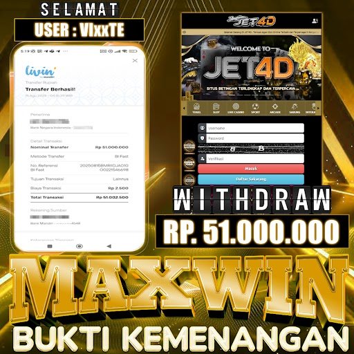 JET4D TERJAMIN DAN DI BIKIN NYAMAN Selamat Kepada Member Setia Atas Withdraw Rp 51.000.000 Hari ini. List member yang sebelumnya mendapatkan withdraw besar bisa cek Disini dan di LINK ini.pelanyanan