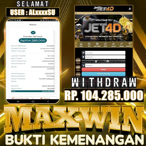 JET4D MINIMAL BET 100 PERAK Selamat Kepada Member Setia Atas Withdraw Rp 20.000.000 Hari ini. List member yang sebelumnya mendapatkan withdraw besar bisa cek Disini dan di LINK ini.pelanyanan nonstop dan