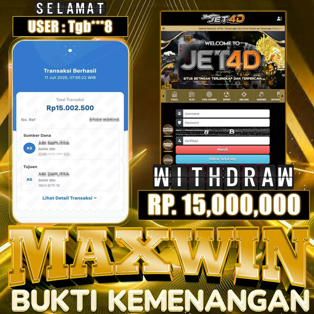 JET4D RAJIN NYEPIN DIKASIH MAXWIN Selamat Kepada Member Setia Atas Withdraw Rp 15.000.000 Hari ini. List member yang sebelumnya mendapatkan withdraw besar bisa cek Disini dan di LINK ini.pelanyanan nonstop dan