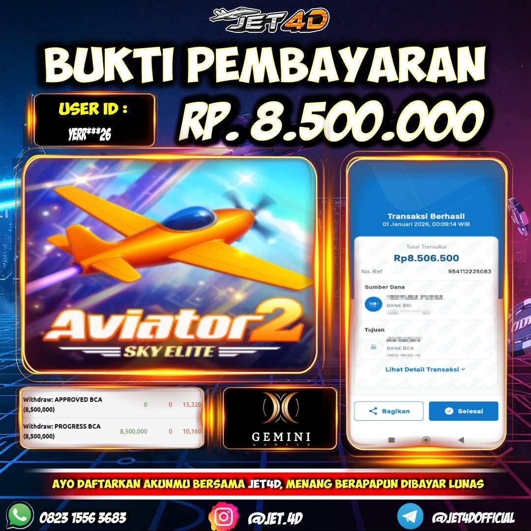 JET4D TERBANGKAN CUANMU SEKARANG Selamat Kepada Member Setia Atas Withdraw Rp 8.500.000 Hari ini. List member yang sebelumnya mendapatkan withdraw besar bisa cek Disini dan di LINK ini.pelanyanan nonstop dan