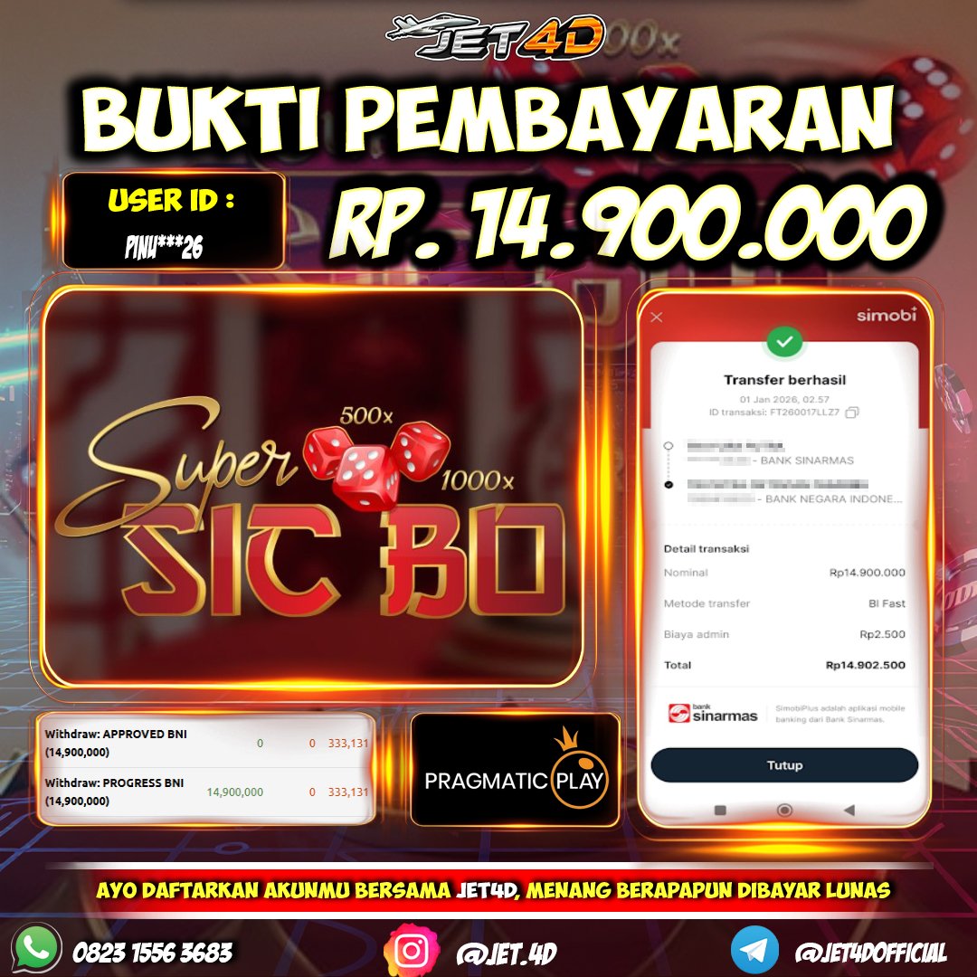 JET4D KEMENANGAN TANPA BATAS Selamat Kepada Member Setia Atas Withdraw Rp 14.500.000 Hari ini. List member yang sebelumnya mendapatkan withdraw besar bisa cek Disini dan di LINK ini.pelanyanan nonstop dan
